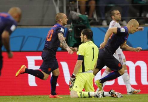 Por toda novedad, un nueve verdadero que era Diego Costa, faro de costa para novedosos pases en largo a la espalda de la defensa del Feyenoord. Lo malo de Costa es que de faro tiene la fijeza pero también el cemento, y tarda en armar la pierna lo mismo más o menos que se tarda en subir a la Torre de Hércules, por citar el faro más viejo de España. Es cierto que superó el minuto ocho, para cabreo de Simeone, pero también que perdonó cuando aún había espacio para la inclemencia. Como vio que tratando de marcar como nueve cierto no lo hacía, lo intentó por lo falso y le salió: penalti bien simulado y gol de Xabi Alonso. La solicitud arbitral en estos trances también es consecuencia de la estrella pectoral, oiga. Y al menos no era japonés. Mediaset al completo vio penal indubitable, claro. Antes había declarado un déjà vu en un rechace de Iker a tiro de Sneijder. Esta precipitación en la analogía que trae la simpleza siempre acaba produciendo monstruos.