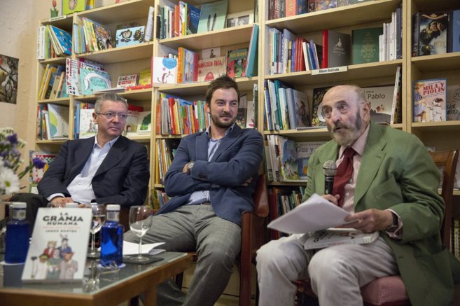 Jorge Bustos es literariamente arisco y no se autocensura: observa el mundo con un ojo de tigre viejo y otro de filósofo ilustrado, se despeina con intención y se asume incómodo pero cierto. Como Twain, cuando se ve del lado de la mayoría, hace una pausa para reflexionar, y de esas cavilaciones vinieron estas fábulas. Ayer presentó su primer libro, La granja humana, en la librería Cervantes de calle Pez, acompañado del escritor Álvaro Pombo y de Alberto Ruiz-Gallardón [«ex político, por favor; político es incorrecto», matizó al comienzo de su intervención, con guasa]. Era aquello una asamblea de hombres insurgentes [cada uno, arriesgado en su estilo] que charlaba con la licencia de haber renunciado a aceptar la política [y la vida] como un monolito de doctrina pacífica.