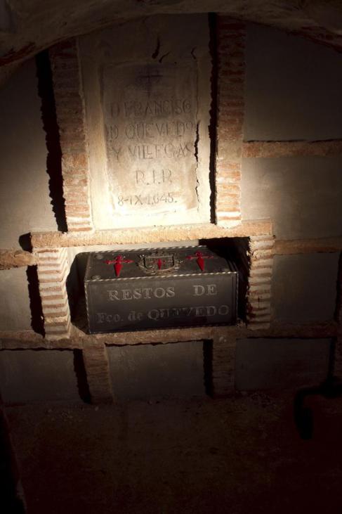 Pasó con este cuerpo un poco lo mismo que con el de Cervantes. En su testamento pide Quevedo ser enterrado con el hábito de Santiago y sus dos espuelas de oro en la iglesia de Santo Domingo, en cuyo convento -que ahora visitaremos- pasó sus últimas semanas. Pero el vicario de San Andrés estimó que era barata sepultura para tan conspicuo difunto: desoye escandalosamente la voluntad expresa de Quevedo y arrima el ascua a su templo con la cooperación necesaria de los Bustos, que ceden encantados su capilla. Pero en el siglo XVIII se remueve el enterramiento y los restos del escritor quedan mezclados con los de un osario común. Para entonces hacía mucho que ya habían profanado la tumba para robar las espuelas de oro. Esto de andar toqueteando fémures se ve que es una costumbre muy nuestra. Aquí no lo dejan a uno tranquilo ni fiambre. Total, que tuvo que venir el mismo antropólogo forense que contrataría luego Ana Botella para individualizar -con mayor grado de certeza que en las Trinitarias- un puñado de huesos quevedianos, que fueron reunidos en esta urna de metal para su venerable exhibición y descanso eterno. Hasta que alguien decida que lo que hay que hacer es llevarlos a Tokio de gira o fumárselos en pipa de kif.